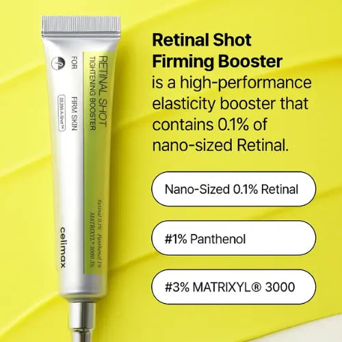 Celimax Vita A Retinal Shot Tightening Booster is a night treatment that targets pores, lines, and laxity with a concentrated blend of actives. It uses 0.1% liposomized retinal alongside a peptide complex to smooth texture and firm skin. The light gel cream sinks in fast and leaves a soft finish that layers well with a simple moisturizer.