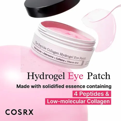 cosrx peptide collagen eye patch is a cooling hydrogel mask for tired under eyes. It blends four peptides with soluble collagen to reduce puffiness and support firm looking skin. The essence hydrates on contact and leaves a fresh finish that layers well with cream. The jar contains 60 patches and 85 g of product.